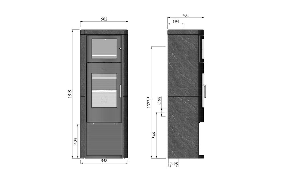 Le grand foyer a une particulièrement bonne production et peut tenir les grandes pièces de bois de chauffage, tandis que le panneauchauffant sur le sommet peut atteindre les températures de jusqu’à 350 °C.
